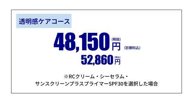 お肌の透明感をアップさせたい方向けのスキンケアプログラムです。基本コースの内容を抑えながら、透明感ケア用のミラミン/シーセラムをお使いになることで、しみ・くすみのない明るい素肌へと導きます。基本コースの次のステップとしてもオススメです。